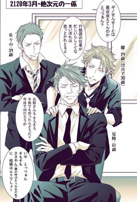 【2120年/全員生存世界の一係・佐々山誕バージョン】 3年前に征陸誕で描いたらくがきを佐々山誕仕様にしてお届けしています。 多分この世界の狡噛さんは優等生のままで、行動課も平和な部署なんだろうと思われます(笑) どこかにあるといいな。こんな世界線… #佐々山光留生誕祭2023