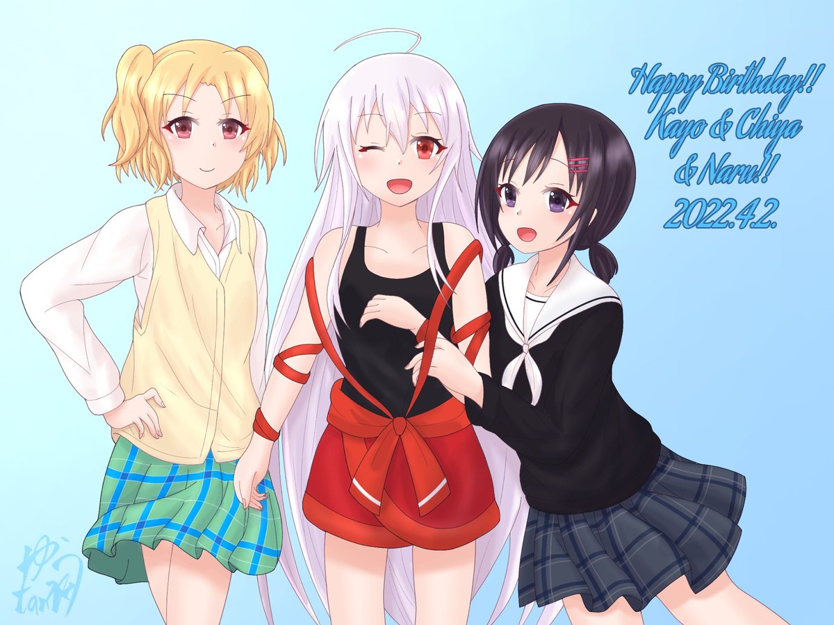 SNS部の音楽担当・歌夜ちゃん、運動神経抜群のうらら・千矢ちゃん、よさこいに出会った少女・なるちゃん、おめでとう! #藤川歌夜生誕祭2022 #ステラのまほう #千矢生誕祭2022 #うらら迷路帖 #関谷なる生誕祭2022 #ハナヤマタ #ゆう誕イラスト #アニメ好きと繫がりたい #イラスト好きさんと繋がりたい