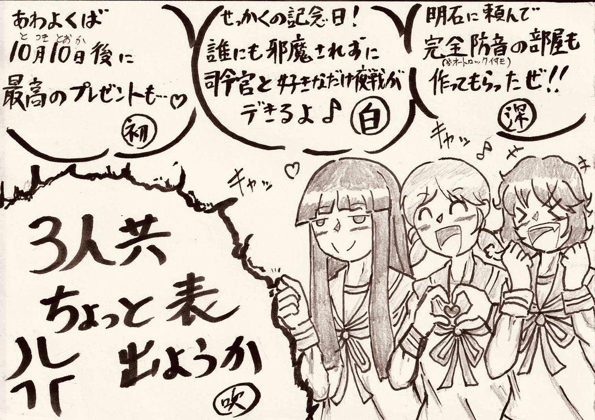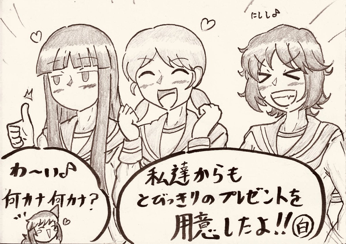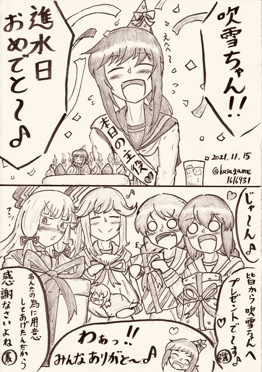 #吹雪版深夜の創作60分一本勝負 @fubuki1draw #吹雪進水日 #吹雪生誕祭2021 お題「本日の主役」 フブキチャン進水日祝いの漫画もどき🎉 久々に吹雪型姉妹全員を描けた気がします