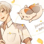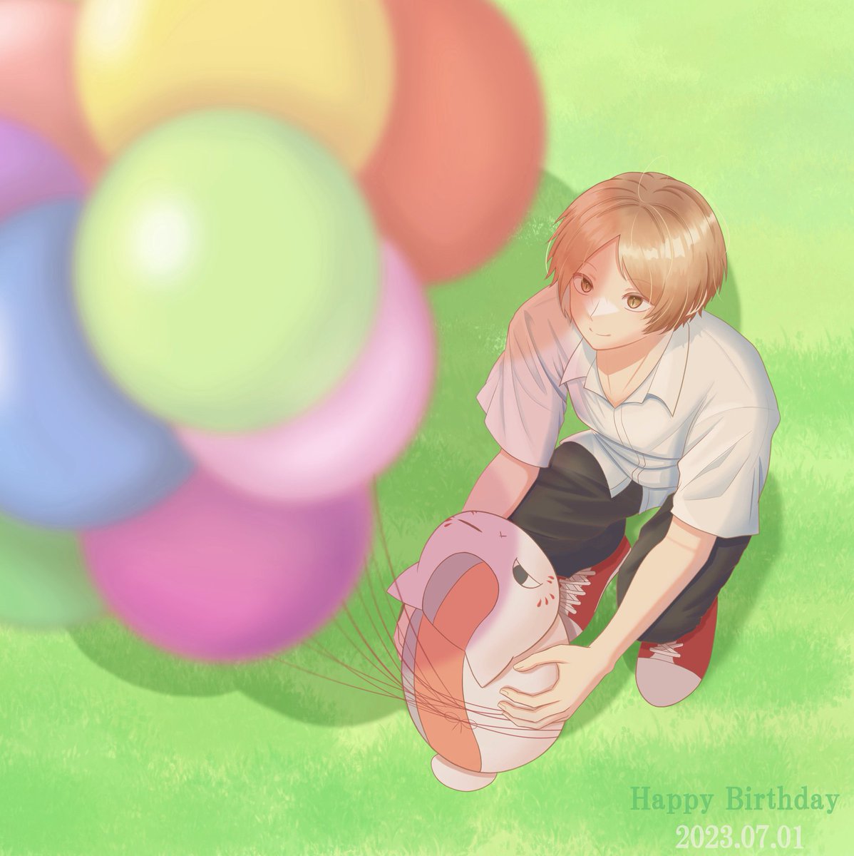 夏目くん誕生日おめでとう! 今年は20周年なので二十歳夏目くんにしてみました。飲めるようになったので、いつかいっしょに飲めることを楽しみにしてた滋さん塔子さんと、犬の会と、同級生たちと一緒に楽しく飲んで欲しいですね #夏目貴志生誕祭2023 #夏目貴志誕生祭2023
