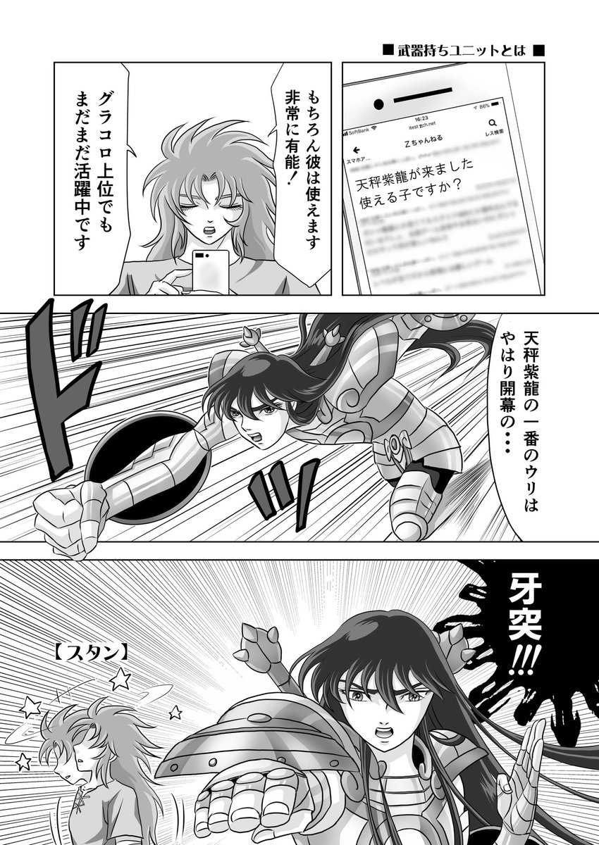 #天秤座の童虎生誕祭2021 童虎おめでとう!新しい物描けないけど3年前に出したZB本にやんちゃな天秤座をたくさん描いたの思い出したので置いておきます。 ZBやってないとわからない、やっててもわからない、3年前のネタ古過ぎてもう誰も理解できない🤣 「武器持ちユニットとは」1/2