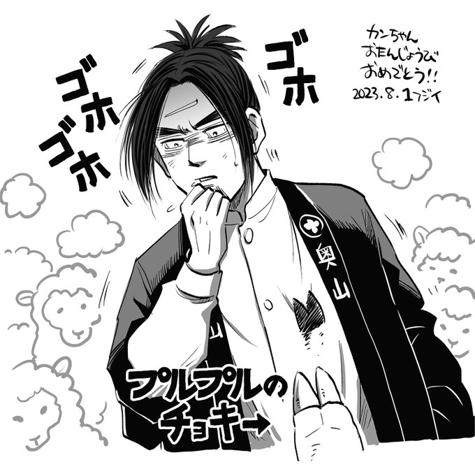 お祝い絵を描くのも間に合わないと思ってたけど、私作ってた‼️夏ちゃん作ってた‼️再掲だしデコセンス無いし日付変わっちゃったけど‼️ おめでとう‼️🎁🎂🎉アニ4期でヒジッジ陣営にしれっと合流してて嬉しかったよ‼️😭 #奥山夏太郎誕生祭2023 #奥山夏太郎生誕祭2023