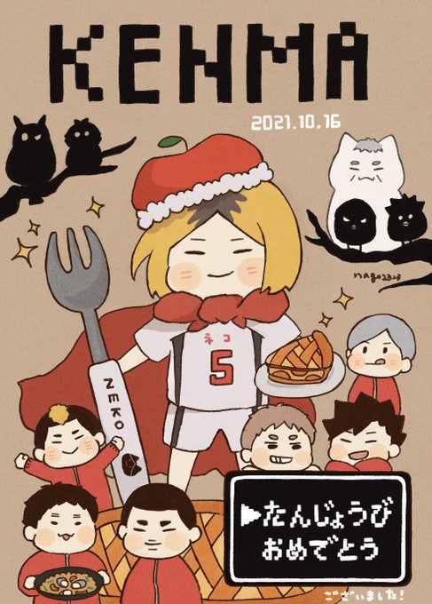 #孤爪研磨生誕祭2021 #孤爪研磨誕生祭2021 おめでとうございます㊗️大人になってもお互いの誕生日に仕掛け合う音駒幼なじみ。ずっと仲良しでいてね🍎🐱🐱🐟 (※うちの黒尾は毎年研磨の誕生日にアップルパイを焼き続けています)