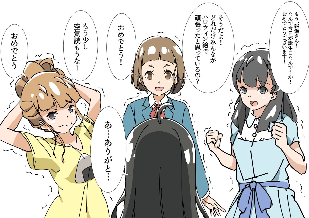 よくわからないことを言って報瀬さんを謎に困惑させるドッキリと自分でも何を言ってるんだろうと吹き出しそうになる3人の図。この後ちゃんとお祝いしました。おめでとう❤ #小淵沢報瀬生誕祭2021