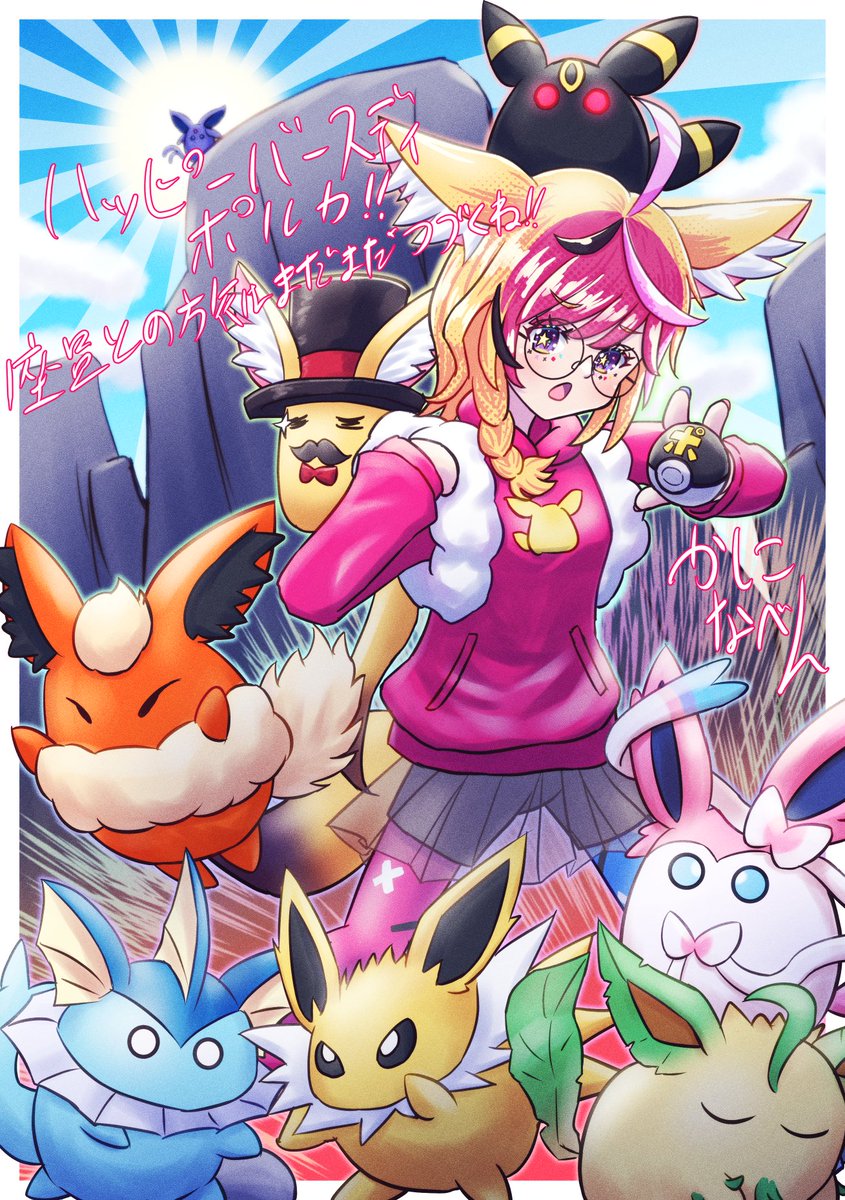 こちらの企画にも参加させていただきました!! テーマはポ〇モンということもあって、 ブイズに扮した座員くんと、どこかで見た衣装を着たトレーナーのポルカ! #尾丸ポルカ生誕祭2023 #絵まる 差分は下の方に twitter.com/polkascircus…