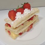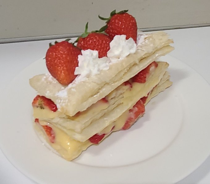 碧音お姉さま誕生日おめでとうございます🎉 たっぷりの大粒いちご、コアントローの香りが漂う上品なカスタードクリーム… それらを、さくさくと歯ざわりのよいパイ生地でサンドした碧音の大好物 手作りのいちごのミルフィーユでお祝いします! #リステ #式宮碧音生誕祭2022