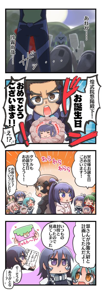 オルタアニメ11話ネタ?4コマ 悠陽殿下&冥夜&タケルちゃんお誕生日おめでとう~✨🎂✨ #御剣冥夜生誕祭2021 #煌武院悠陽生誕祭2021 #白銀武生誕祭2021 #マブラヴアニメ #マブラヴ