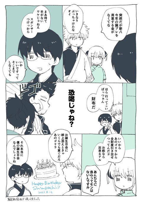 👓️「いやぁ、僕の日がきましたね!」 🍓🐰「……」 👓️「みてください、公式PVにたくさんの祝絵にアイコン!TLに僕があふれてますよ!」 🐰「……🍒の癖におしゃれラテなんてナマイキアル!沈めるアル!」 👓️「…🍒関係ねぇえええぇ!」 #志村新八生誕祭2023 #志村新八誕生祭2023 #ちゅんずでー