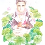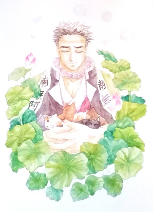 #悲鳴嶼行冥誕生祭2022 #悲鳴嶼行冥生誕祭2022 心穏やかに。 【模写アレンジ/水彩】 先日ブツを拝見し穏やかな笑顔に癒やされたのでヒメさんにも笑ってほしくて。そこのお庭に咲いていた蓮と共に。