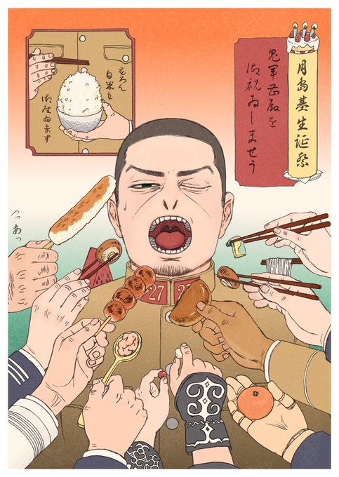 ツキシマさん、お誕生日おめでとーう! 貴方の上に祝福が降りそそぎますように!🍙🍚🥢 今年で150さいくらい…?鬼…? #月島基生誕祭2023 #月島基誕生祭2023 #月島軍曹生誕祭2023 #月島軍曹誕生祭2023