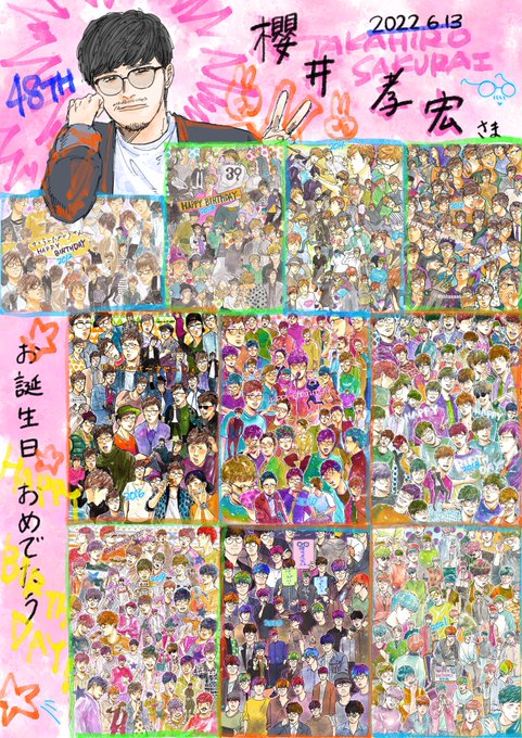 櫻井孝宏さん48歳のお誕生日おめでとうございます!櫻井さんが好きだ!という事で沢山描いていたら100キャラになっていました。全キャラ分かってくれた方私と握手お願いします!w アニメやラジオでお忙しいとは思いますがお身体に気を付けて今年もお活躍を楽しみにしております。 #櫻井孝宏誕生祭2022