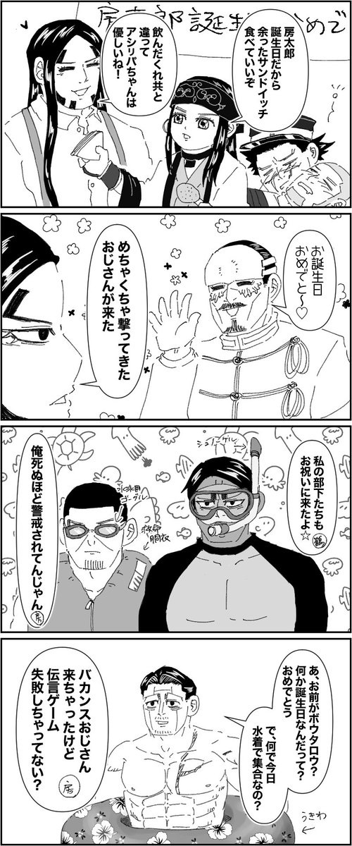 #海賊房太郎誕生祭2022 #海賊房太郎生誕祭2022 お誕生日おめでとうございます!関東に台風直撃当日ってのも房太郎さんぽいな。 ある意味建前で争奪戦に参加してるアシㇼパさんに女の気づきを与えたひと… アシㇼパさんの「成長」は男性(しかもイケメン)からもたらされる事が多いのが結構エロす。