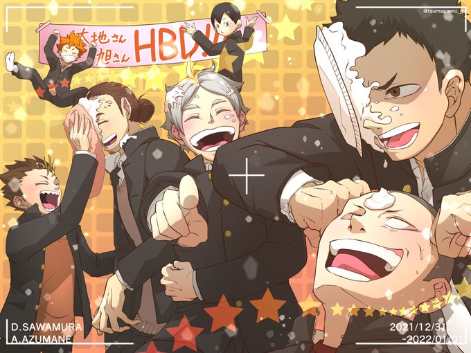 なんとか~間に合った!! と言うか・・・苦肉の策で大地さんBD(12/31)と旭さんBD(1/1)と謹賀新年の挨拶を烏野3年ズで✨←無茶ぶりし過ぎw🤣 大好きな3人の笑顔で佳いお年を!!&明けましておめでとうございます㊗🎍😊 #澤村大地誕生祭2021 #東峰旭誕生祭2022