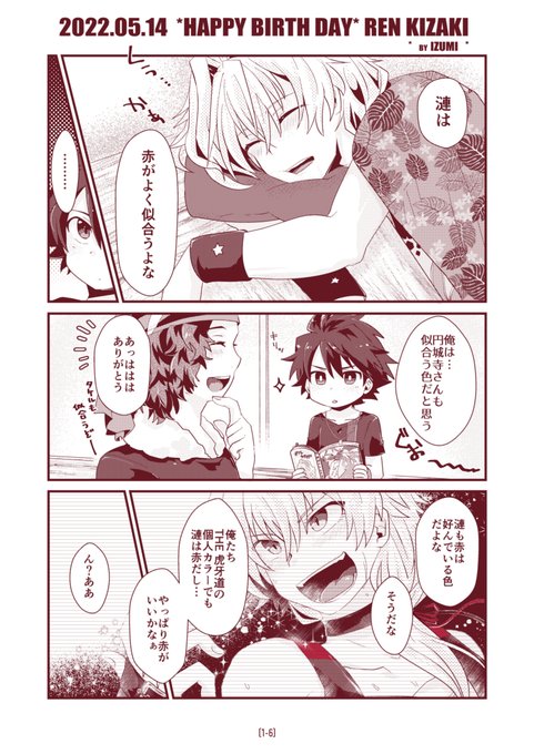 漣~!お誕生日おめでとうございます! 一周まわってユニットで一緒に居るの至高だなぁって。 美味しいもの沢山たべてこれからも健康で一番でいてね~! #牙崎漣誕生祭2022 #牙崎漣生誕祭2022