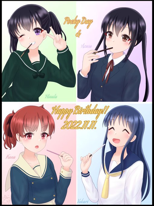 今日は4人です!!ひなた、あずにゃん、花和、縁、おめでとう!! #倉上ひなた生誕祭2022 #ヤマノススメ #アニマエール #牛久花和生誕祭2022 #中野梓生誕祭2022 #けいおん #日向縁生誕祭2022 #ゆゆ式 #ゆう誕イラスト #ポッキープリッツの日 #アニメ好きと繫がりたい #イラスト好きさんと繋がりたい