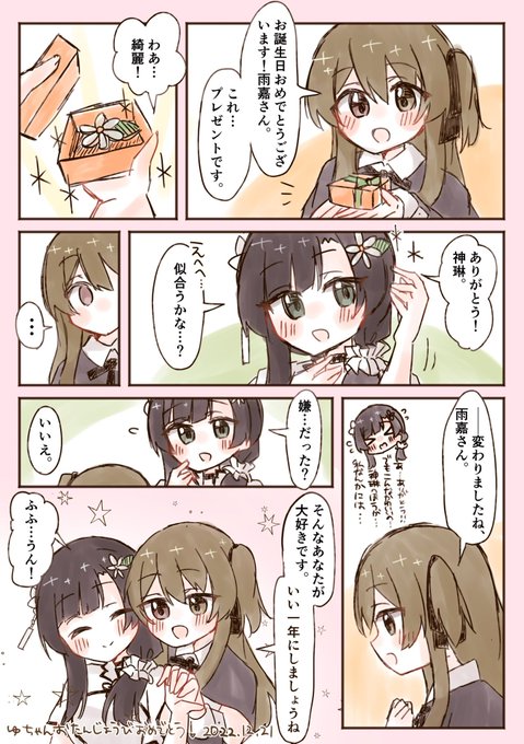 梨璃「3人共、今日は二水ちゃんと雨嘉さんの誕生日ですよ…日葵さんのじゃないですよ…?」 来夢「楪様と純様もです…どうして毎回こうなんです?」 雨嘉「梨璃…来夢も…ちょっとやり過ぎだよ…」 二水「ふふ…」 #アサルトリリィ #アサルトリリィドール部 #二川二水生誕祭2022 #王雨嘉生誕祭2022