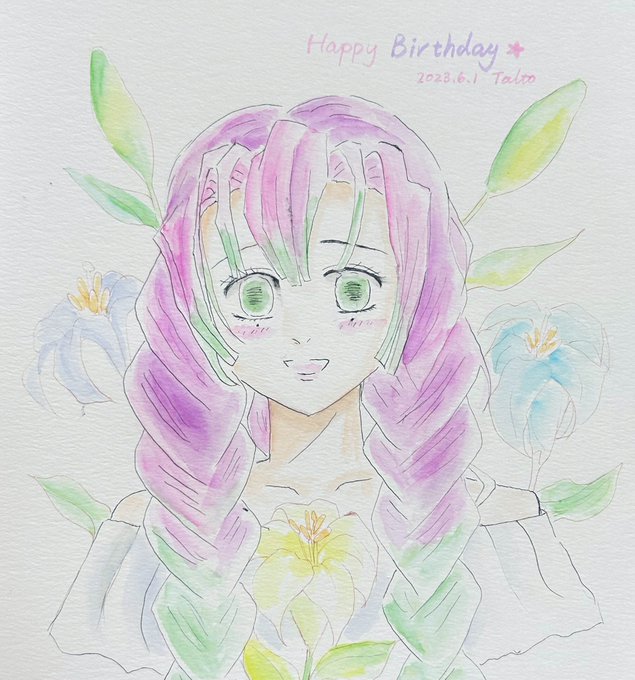 皆さんの素敵な蜜璃ちゃん見ていたらお誕生日が終わってた🤣💦 おめでとう㊗️‼️ 大好きな人達と美味しいものを沢山食べて笑っていて欲しい💗 大好き🥰🍡💕 #水彩 #模写 #甘露寺蜜璃生誕祭2023 #甘露寺蜜璃誕生祭2023