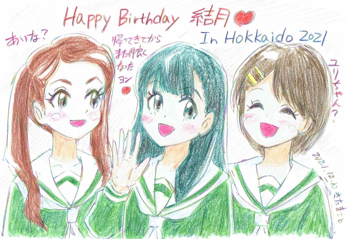#白石結月誕生祭2021 結月ちゃん誕生日おめでとう! あいなちゃんとユリちゃんも実は後悔していて、また仲良くなって結月ちゃんをお祝いしている世界線を想像して描きましたw #白石結月生誕祭2021 #宇宙よりも遠い場所 #よりもい #yorimoi