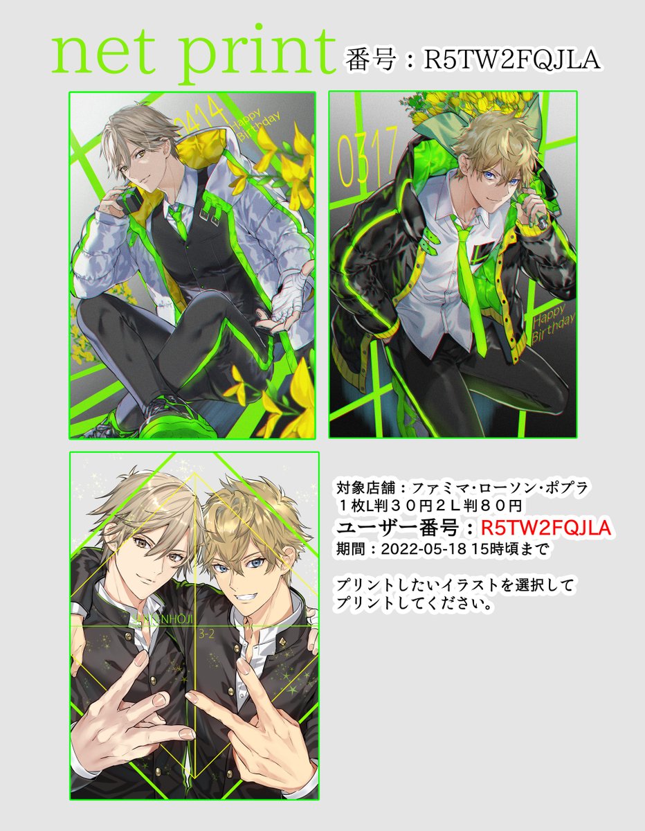 白石と謙也誕生日イラストと3-2の日のイラストのネップリ始めました。 ファミマ・ローソン・ポプラで印刷可能 ユーザー番号:R5TW2FQJLA 期間:2022-05-18 15時頃まで 印刷したいイラストを選択して印刷してください。 1枚につきL判30円2L判80円 #白石蔵ノ介誕生祭2022 #忍足謙也誕生祭2022