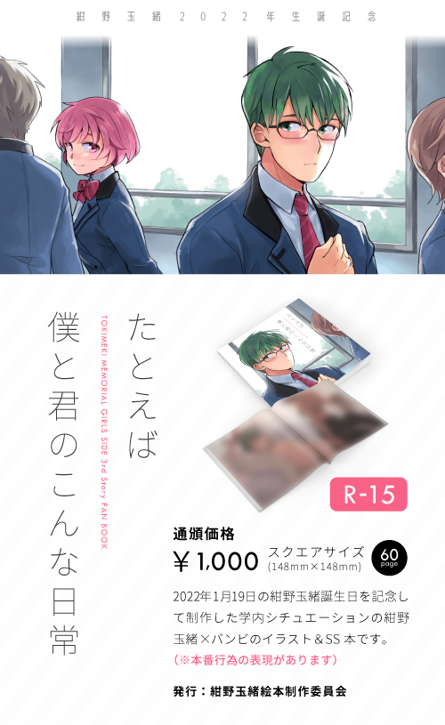 🎊紺野玉緒×バンビ🎊 「たとえば僕と君のこんな日常」 R15/A5正方形/60P※表紙含/1000円 イラスト&SS集❣️本番行為の表現有 玉緒先輩のお誕生日記念に制作🎉 #紺野玉緒生誕祭2022 二人の校内の様々なシーンをイラストとSSで綴った本です🎂 BOOTH🔗 kijihajimetenaku.booth.pm/items/3589466