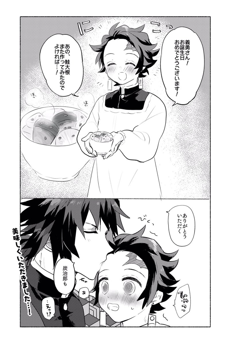 #義炭によるぎゆさん誕生祭2022 あと7日⁉️ 義勇さん26歳、炭治郎16歳 炭治郎「冨岡先生‼️お誕生日おめでとうございます」 義勇さん「プレゼントなら受け取れない」 炭治郎「そう言われると思って、特製鮭大根パンの【試作品】をもってきました‼️味の感想お願いします」