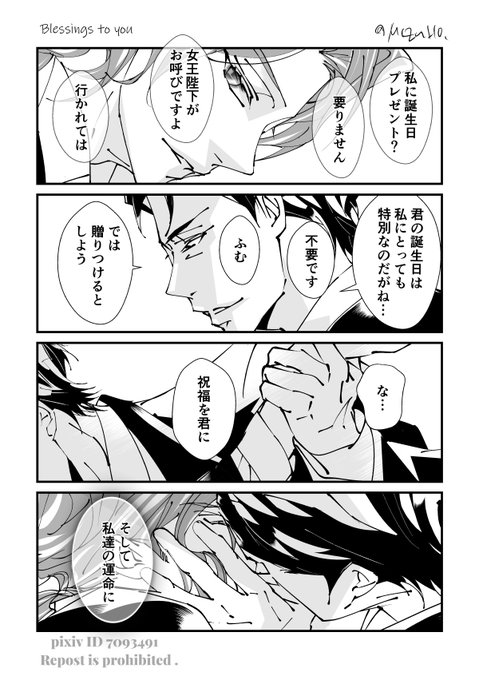 🌹長官からの🎁 A: Birthday present? No, thank you. The Queen wants to see you, you should go. M: Your birthday is very special to me... A: No thanks M: Hmm. Then I shall present it to you. A: What did you say? M: Blessings to you(And to our destiny) #薔薇の伯爵生誕祭2023