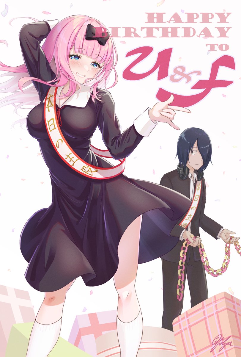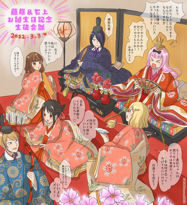 千花ちゃん、石上くん お誕生日おめでとう‼️😊🎁🎂 あと約1ヶ月でお二人の活躍を見れることを心待ちにしております ラップ🎤テスト📝文化祭🎈 そして腕相撲💪楽しみにしてます笑 追伸 (謎絵でごめん🙏笑) (去年のも再掲) #かぐや様 #藤原千花生誕祭2022 #石上優生誕祭2022