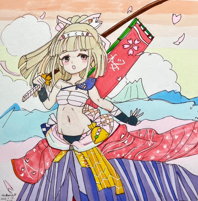 今日は #バトガ の藤宮桜の誕生日。 こちらの過去絵でお祝い! #ごまおつ の光の学園乙女、アンゼリカとの共通点は和風なところ。いつか桜とアンゼリカが忍者コスでコラボしたらいいな。 桜、お誕生日おめでとう! #藤宮桜生誕祭2023 #ゴ魔乙 #ゴ魔乙ファンアート