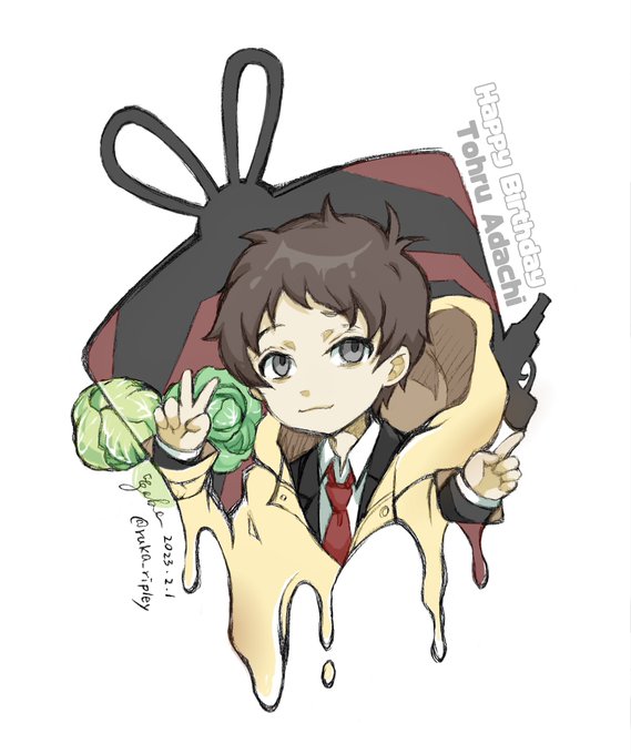 足立さん自身は誕生日とか何がめでたいんだよって思ってそうですけれど 生まれてきてくれてありがとうございます〜‥!! よくもわるくも人間らしい足立さんのことがずっと好きです おめでとう!!✨🎁🎂🥬 #足立透生誕祭2023 #足立透誕生祭2023