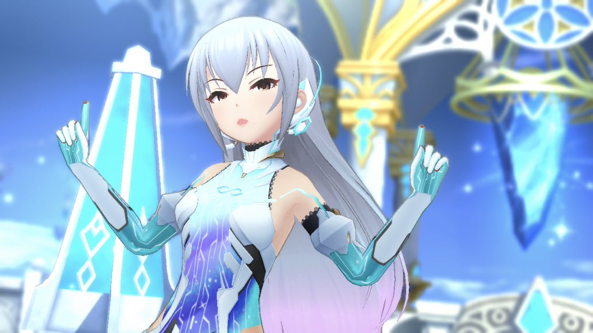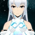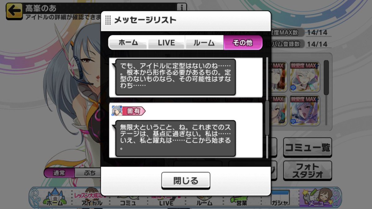 イン・ヒューマン衣装の胸元にあるマーク、DNAの螺旋構造のようにも、無限大マークのようにも見えますが、R特訓後の親愛度MAX時にアイドルの可能性を無限大と見出しているので、アイドルという人の身に秘めた己の可能性を信じる象徴なのかも。 #高峯のあ #高峯のあ誕生祭2023