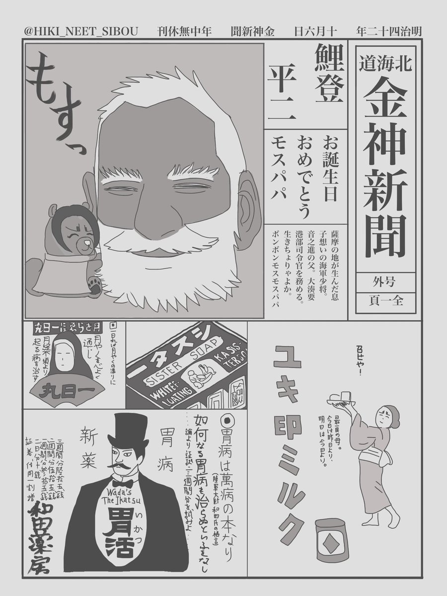 モスパパお誕生日おめでとうございもすっ🥳🎉 新聞パロやりたかったので号外を出してみましたー✨ 広告は一部トレス全パロです! #鯉登平二生誕祭2022 #鯉登平二誕生祭2022 #モスパパバースデー