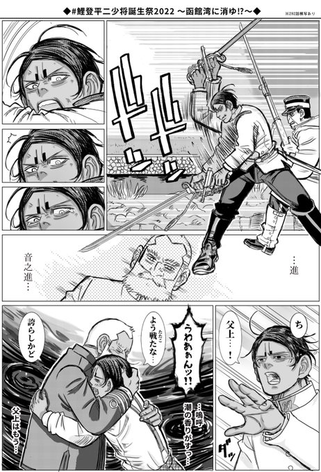 #鯉登平二生誕祭2022 #鯉登平二誕生祭2022 誕生日おめでとうございます🎉「国の為に●ね」と言った直後に、息子救出に爆走!軍人としての大義より、父としての愛情を優先してしまう人間らしさが大好きです☺️ 「雷」の操舵室は剥き出しだから、きっと海に投げ出されて生きてると信じて…パパ漫画を再掲!