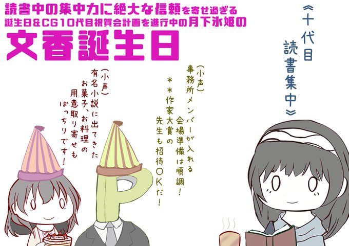 Q.目の前で誕生日会の相談するのは如何か? A.肇ちゃん&P『読書中の文香(さん)が気付くとでも???』 昼は読書の時間と夜はCG就任&誕生会がプレゼント ところでちひろさん、所属アイドル(190人)呼べる会場代は経費で(文章はここで終わっている) #鷺沢文香生誕祭2021 #鷺沢文香誕生祭2021