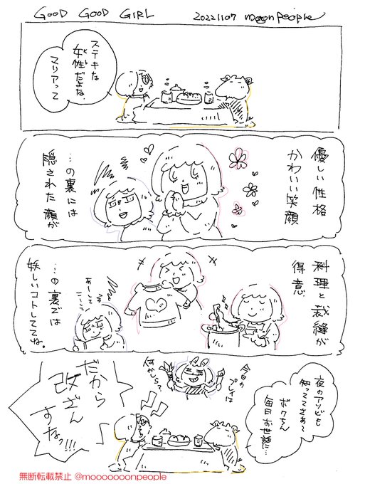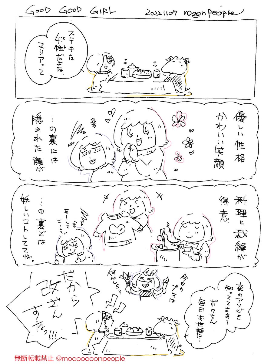 2022.11.07 GOOD GOOD GIRL「彼女はいいおんな」 優しくて魅力的で何でも出来て裏の顔があって…? 11月7日は #いい女の日 ということで。 ギャップがあるコってステキやん。 #4コマ漫画 #創作漫画 #オリキャラ #コメディ #漫画が読めるハッシュタグ twitter.com/mooooooonpeopl…