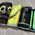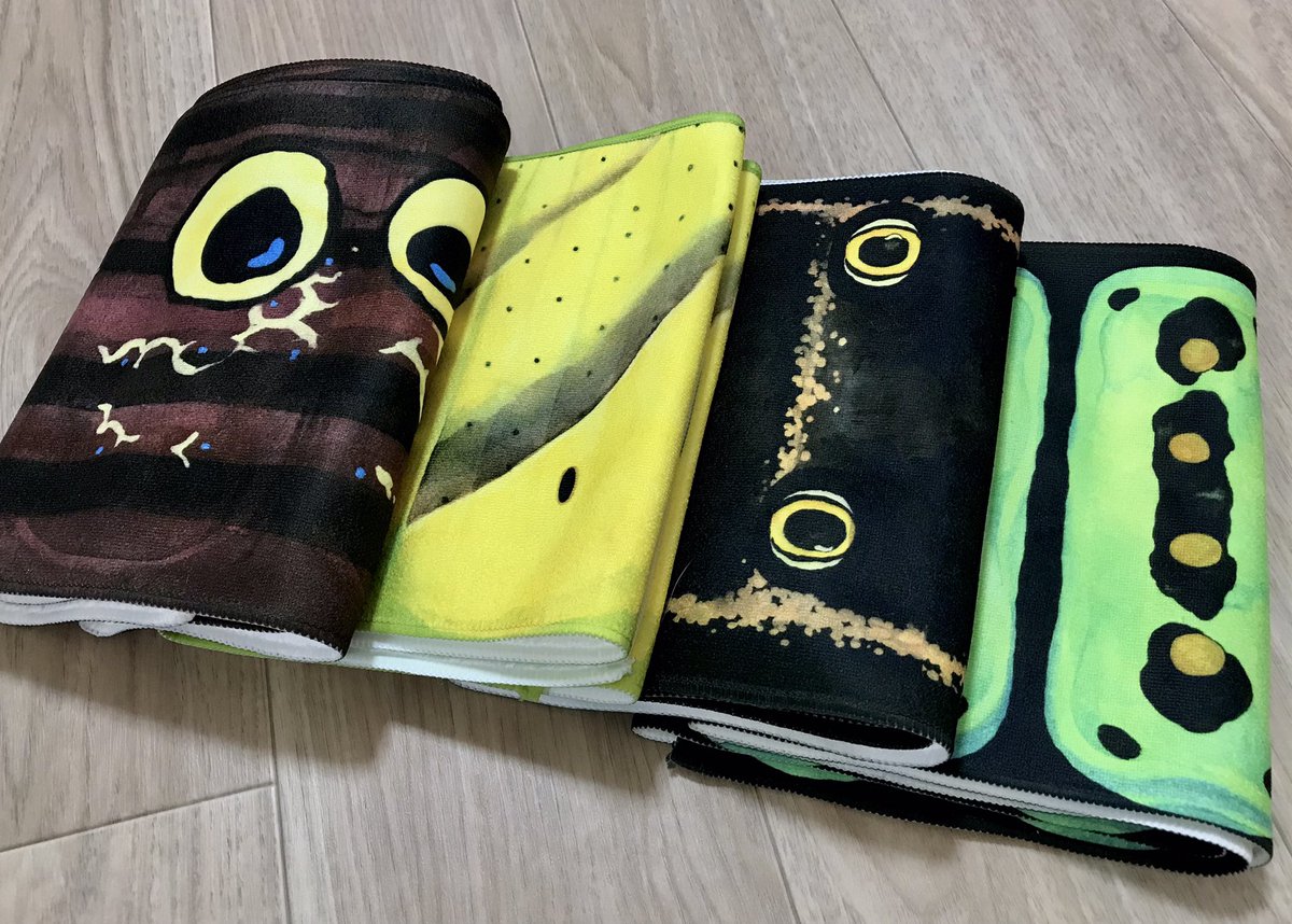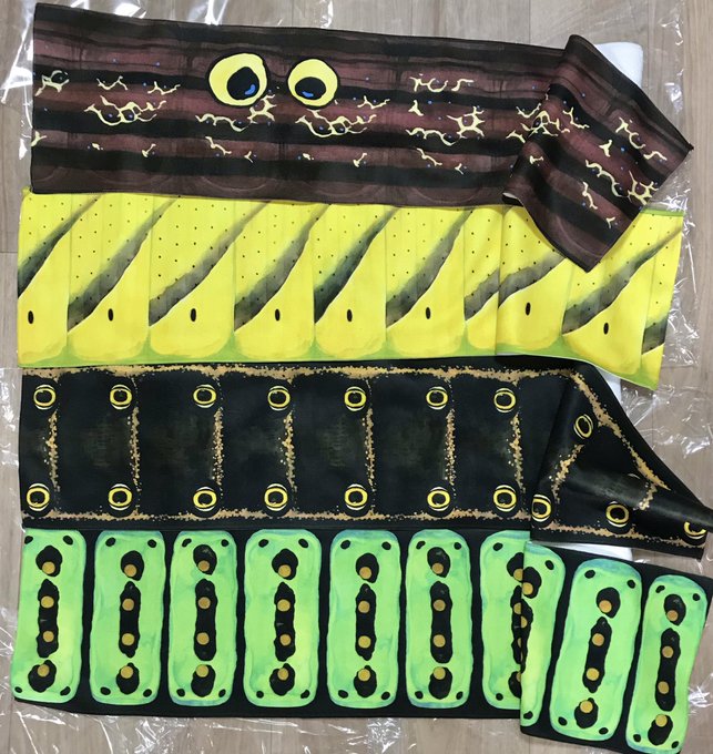 新作のいもむしマフラータオルです。表の印刷面はすべすべ、裏はふわふわのタオル地になってます…首に巻くとイモマフになる キアゲハ、セスジスズメ、クロメンガタスズメ、アケビコノハの4種🐛いきもにあに持っていきます #いきもにあ2022