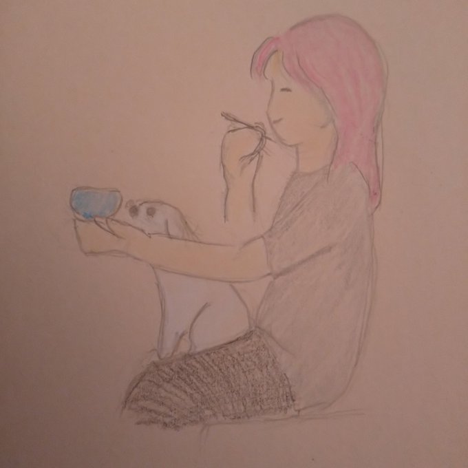 おはようございます🌞 ごはんを食べる私と、時々に背中にごはん粒がついている犬さん🐶🐾 今週も頑張りますか…そうしましょう🥰 #イラスト #イラスト好きさんと繋がりたい #絵描きさんと繋がりたい #いぬいらすと #いぬのきもち #落書き #落書イラ #色鉛筆イラスト