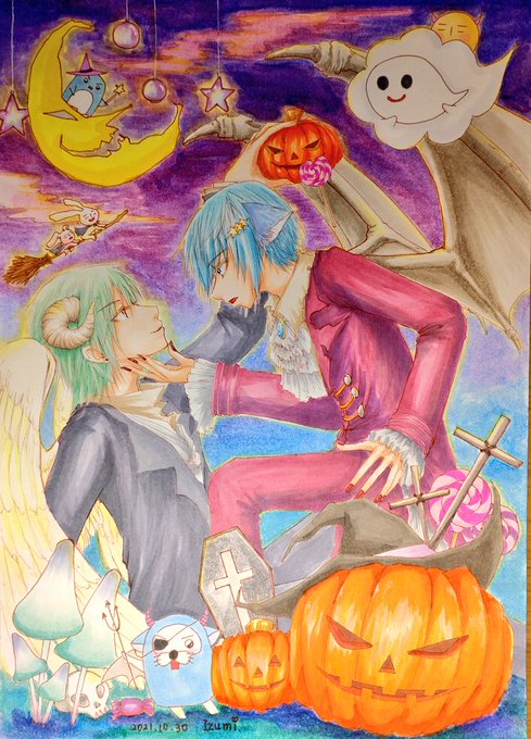 ぬぐりくん達のハロウィン #ハロウィンイラスト #ハロウィンイラスト展示会2021 #オリキャラ #ぬぐりくん #海 #イラスト #アナログ #ぬぐりくんと仲間たち #うちの子とハロウィン #絵柄好みって人にフォローされたい カイとぬぐりです。 通常ver.でも集合させてみました(モノクロのやつ)