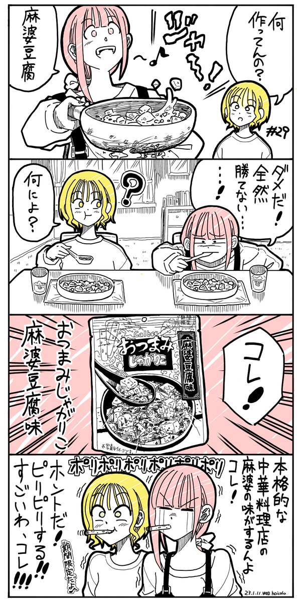 #29 おつまみじゃがりこ 麻婆豆腐味 おつまみじゃがりこのクオリィティー、凄いです! 本当に麻婆!! 期間限定だから売っていたら買いですよ。 近所のまいばすけっとには売ってた。😃 #4コマ #漫画が読めるハッシュタグ #おつまみじゃがりこ #麻婆豆腐