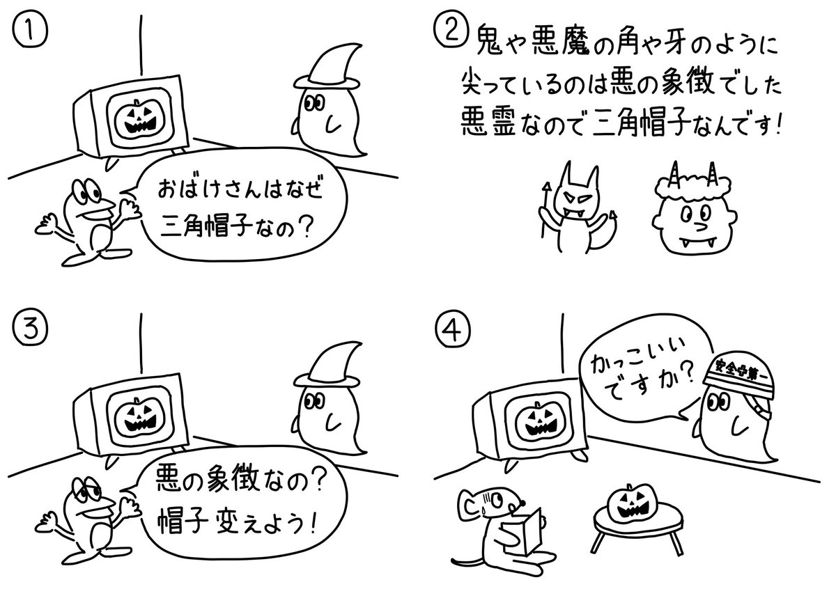 129シュールなおばけの帽子 おばけさんにいたずらしてはいけません🐭 #漫画が読めるハッシュタグ #絵描きさんと繫がりたい #みんなで楽しむTwitter展覧会 #4コマ漫画 #ハロウィン #おばけ #帽子 #HappyHalloween