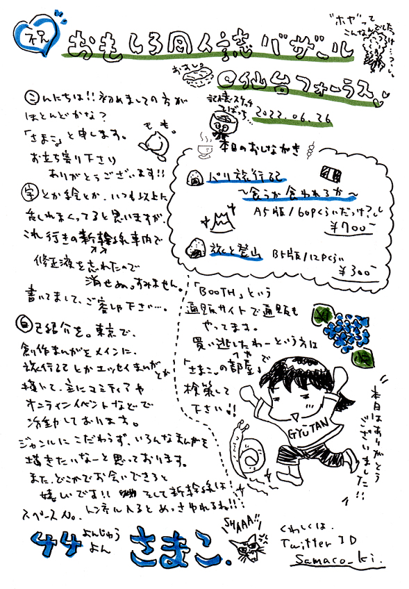11/6 #おもしろ同人誌バザール のチラシ完成!B5サイズ両面、みっちり描きました!アネックス、ろ-106で配布します。半年以上、妄想のマンガ化に夢中になっているので新刊はありませんが、合同誌や旅行記など既刊は豊富ですよ! 今年買い替えたプリンタが絶好調で印刷してくれました!速い!大感謝!