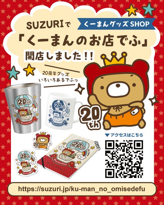 【お知らせでふ!】 くーまん20周年を記念して、 SUZURIでくーまんグッズのお店を開店しました! 20周年記念グッズなど販売していますので ぜひ遊びにきてくださいね♪ くーまんといつでもいっしょにいられるグッズがあるでふよ~! 【SUZURI/くーまんのお店でふ】suzuri.jp/ku-man_no_omis… #くーまん