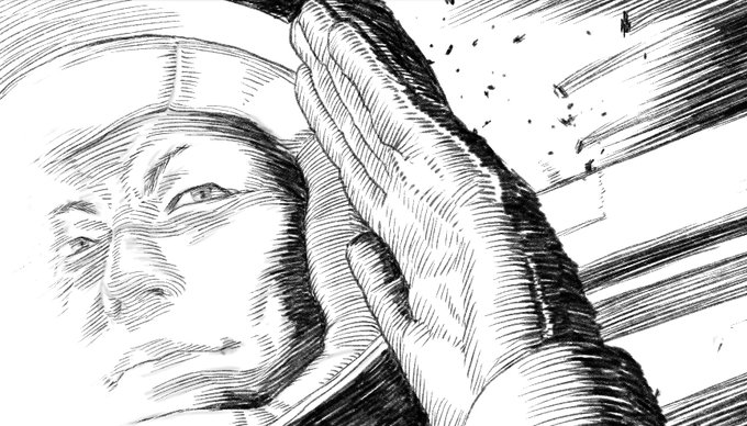 第一巻の終盤。 土煙の中から現れたのは、高々と屹立する二つ折りのバスターランチャー、激しくうねるスタビライザー、響き渡るイレーザーエンジンの音、光り輝く黄金の巨体。 ファイブスター物語ファンなら #このシーン嫌いな人いない説 #ファイブスター物語 #FSS_jp
