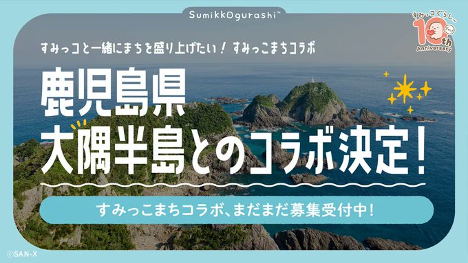 \すみっこまちコラボ第1弾決定/ 現在募集中のすみっこまちコラボ第1弾が九州の南のすみっこ「大隅半島」に決定✨ コラボ内容は随時お伝えします! すみっこまちはまだまだ募集中▼ sumikkogurashi-10th-machicollabo.jp #すみっコぐらし10周年