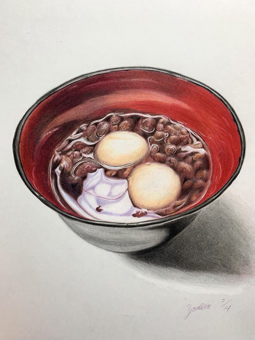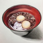 色鉛筆で描いた「ぜんざい」🫘 ぼんぼん先生の 色鉛筆画教室のお題です🧑🏻🏫✨ ((꜆꜄ ˙꒳˙)꜆꜄꜆モチモチモチモチモチモチモチモチ #色鉛筆画 #色鉛筆 #ぜんざい #colorpencil #colorpencildrawing