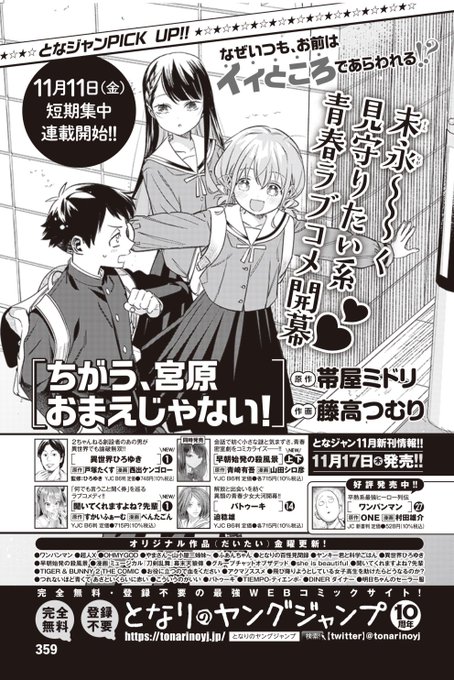 告知です‼️ 今日発売のヤングジャンプに予告が載ってます‼️ 11月11日(金)より #となりのヤングジャンプ にて帯屋ミドリ先生(@obiyamidori)原作の短期集中連載『 ちがう、宮原おまえじゃない!』の作画担当させていただきました! 初連載で緊張していますが宜しくお願いします‼️