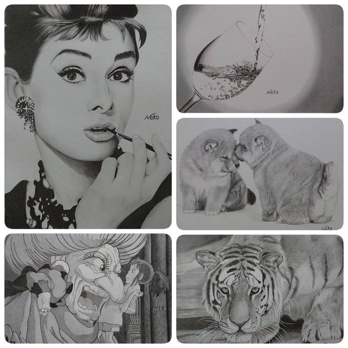 #今月描いた絵を晒そう 今月は5枚でした 年が明けたと思ったら1月も終わりですね 早いですねぇ ヒューン =͟͟͞͞ ( ˙꒳˙)←1月 #鉛筆画 #シャーペン画 #模写 #似顔絵 #オードリー・ヘップバーン #とら #犬 #千と千尋の神隠し #グラス #水 #みんなで楽しむTwitte展覧会