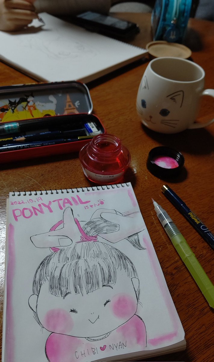 #インクトーバー に母娘で参加中 10月19日のお題は #PONYTAIL (ФωФ) クセっ毛の娘はポニーテールにするとタテ巻きロールになってたのが可愛かったのよ✨ (σωσ) ポニーテールと言えば! (ФωФ) ウィンリー可愛いよね! #inktober2022 #inktober #にゃん家もお絵描き