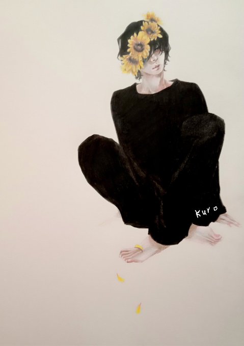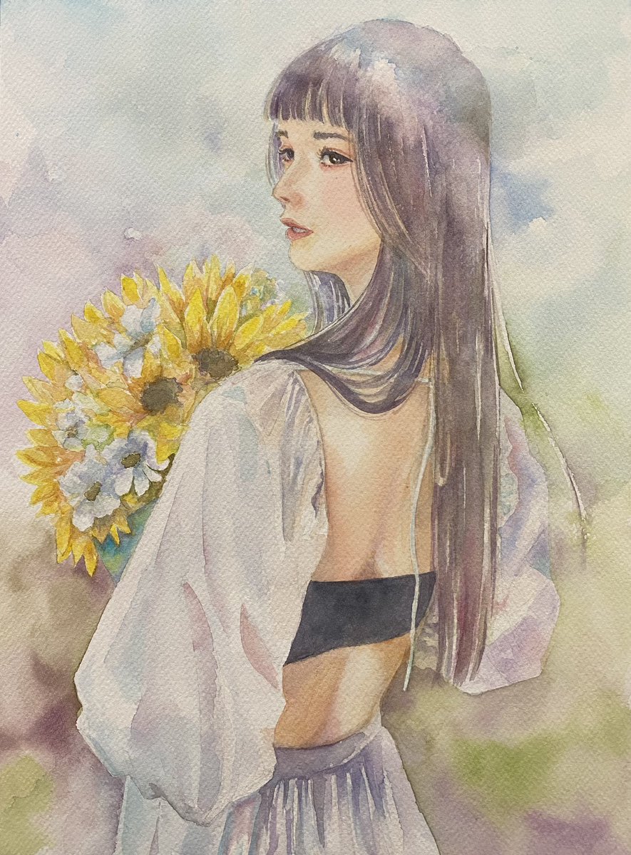 久しぶりの水彩画💕 夏っぽくひまわり🌻描いてみたけど、お花描いた事あまりないので…難しい💦 #透明水彩 #水彩画 #人物画 #ひまわり #絵柄が好みっていう人にフォローされたい #絵描きさんと繋がりたい