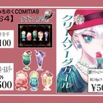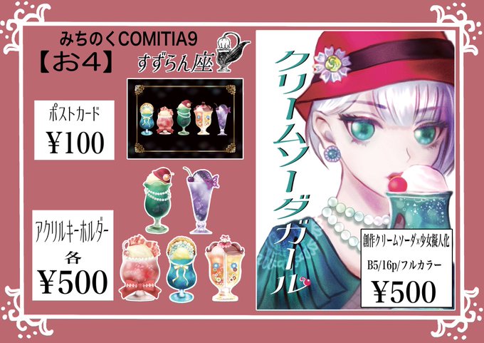 12/11みちのくコミティア参加します! 【お4】すずらん座 お品書きです。 5種類のクリームソーダを女の子にしたフルカラーイラスト集 アクキー、ポストカード もしかしたらドローイング作品持っていくかもです。 お気軽にお越しください✨ #みちのくコミティア #みちのくCOMITIA