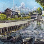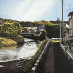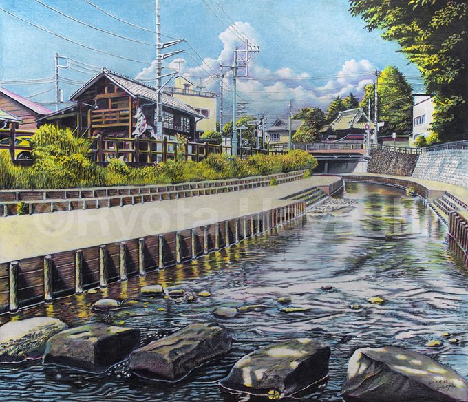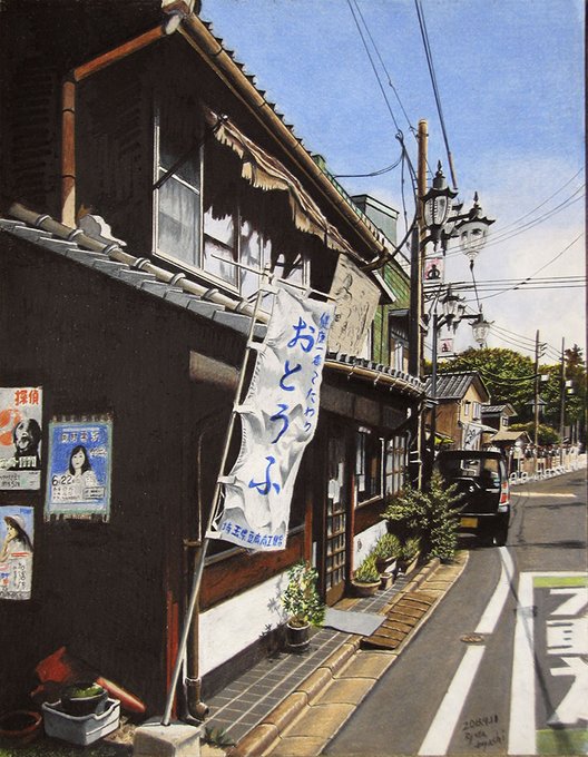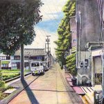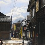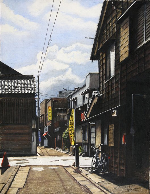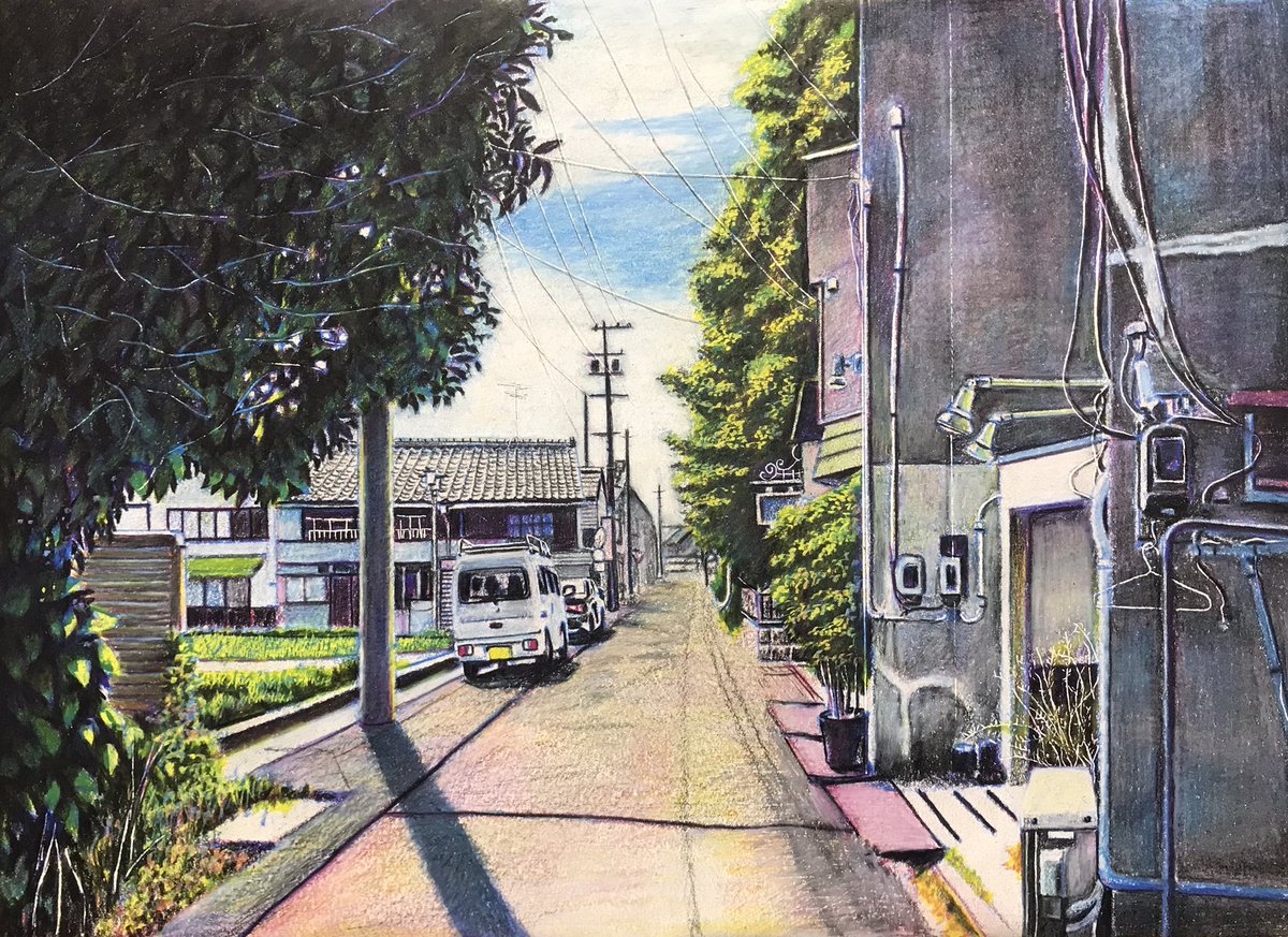 「瓦屋根のある風景」その5。「夏の路地 川越市仲町」/2013年/F6 場所は川越市。観光地的な通りと生活道路の交差点。夏の光を反射する瓦屋根。川越らしい風景。 ryota884.thebase.in/items/57372006 #色鉛筆画 #林亮太 #風景画 #みんなで色鉛筆イラスト見せ合おうよ
